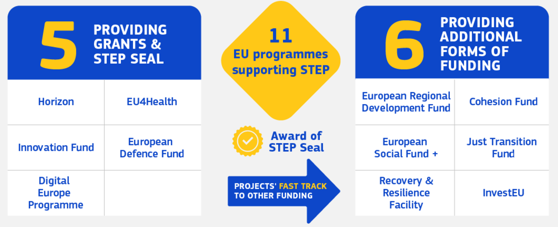 “To support the Union’s long-term competitiveness in critical technologies, STEP is set to channel investments into critical projects in digital deep tech, biotech and clean tech, drive innovation and contributing to addressing skills shortages in STEP sectors. In particular, STEP reorients 11 EU programmes towards STEP sectors and objectives, establishes a STEP Seal to award relevant projects and showcases them on a STEP online portal”.